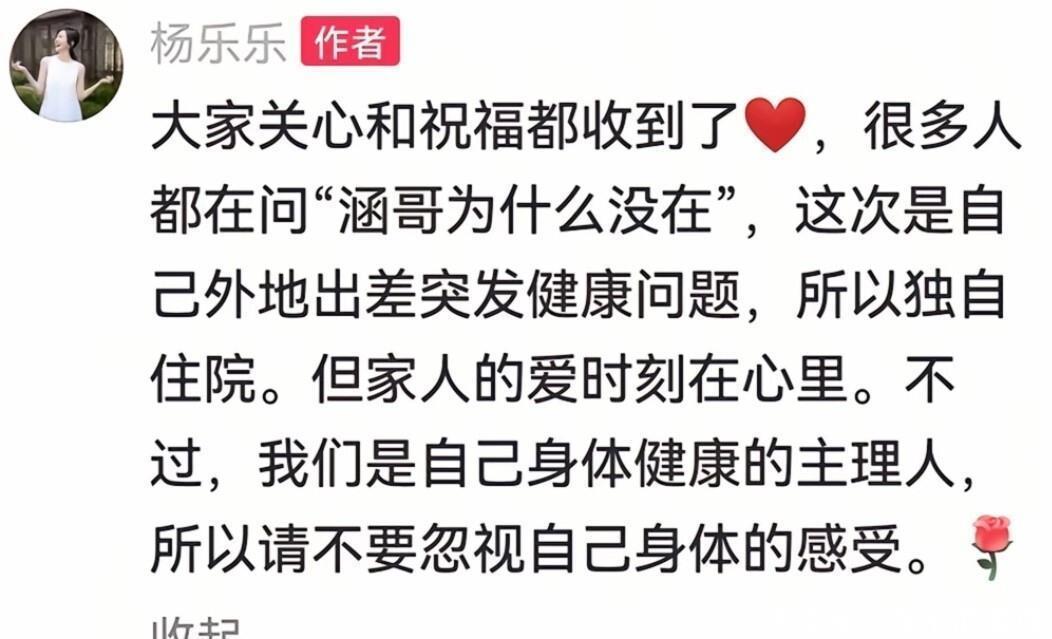 杨乐乐在后续澄清中解释,汪涵当时在长沙带娃开学并录制节目,确实无法赶到外地陪护。 她强调:“家人的爱时刻在心里,不是所有关心都要摆在明面上。 ”这种冷静的回应,揭开了婚姻的另一面:中年夫妻的相处模式,早已从热恋期的形影不离,转向责任分工下的相互支撑。 汪涵曾因肝病住院时,杨乐乐也曾放下工作全程照顾;而此次杨乐乐突发疾病,汪涵则承担起带娃和工作的责任。 这种“错位陪伴”,恰恰是婚姻长期磨合后的默契。